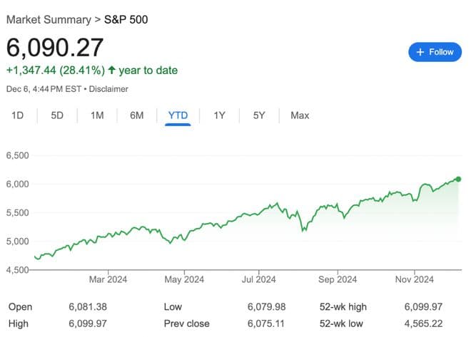 Hartnett进一步表示,如果标普500指数继续涨至6666点(较当前水平再涨约10%),那么2025年初美股“超调”的风险很高。