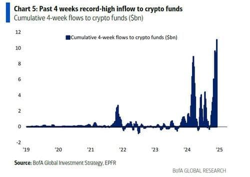 其中有82亿美元流入股票,为连续第9周净流入,49亿美元流入债券市场,30亿美元用于加密货币,加密货币市场过去四周的资金净流入额创下历史新高,达到110亿美元。
