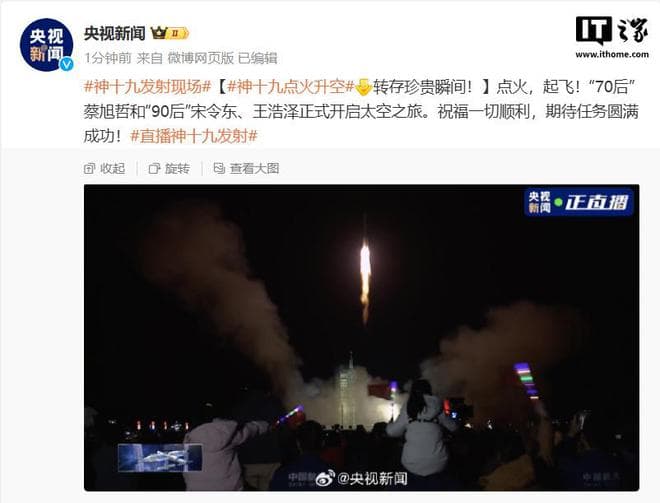 IT之家获悉,北京时间 10 月 30 日 4 时 27 分,搭载神舟十九号载人飞船的长征二号 F 遥十九运载火箭在酒泉卫星发射中心点火发射。4 时 45 分左右,神舟十九号载人飞船与火箭成功分离,进入预定轨道,航天员乘组状态良好,发射取得圆满成功。