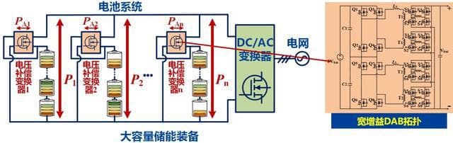 大容量储能装备中,由于储能电池芯出厂时参数不完全一致,存在细微差异,当成百上千只电池芯直接串联形成电池簇,多个电池簇再并联形成电池系统时,容易导致各电池簇内部状态不一致,最终造成并联电池簇间电压差异,引发并联环流,造成经济性降低。传统技术路线多采用功耗约占装备额定输出功率1.5%的全功率变换器抑制电池间电压差异,大幅增加了系统损耗、成本和体积。