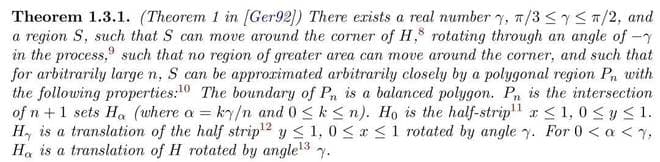 步骤 3-(c) 使用 Mamikon 定理确定 Q 在 L 上的凹度(上图 1.13)。步骤 3-(d) 计算由 Gerver 沙发 G 产生的凸体 (K,B,D) ∈ L 处 Q 的方向导数。Romik [Rom18] 在 G 上的局部最优 ODE 用于表明方向导数始终为非正值。这意味着 G 是 Q 在 L 中的局部最优值。Q 在 L 上的凹度意味着 G 也是 Q 在 L 中的全局最优值。由于 G 处 Q 的值与面积匹配,沙发 G 也全局最大化了面积,最终完成定理 1.1.1 的证明。