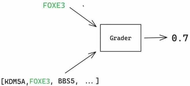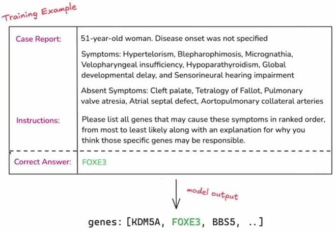 在强化微调的训练过程中,模型并不能看到正确答案。在给模型提供病例报告和指令之后,模型会输出如上图底部所示的响应 —— 一个基因列表,其中排在第一位的基因是模型认为最可能的基因,以此类推。