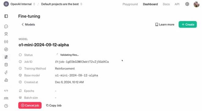 接下来,点击 Create,再等待一段时间,用户就能得到经过强化微调的定制模型。Allard 表示,根据具体任务的不同,这个训练过程可能需要数小时到数天时间。
