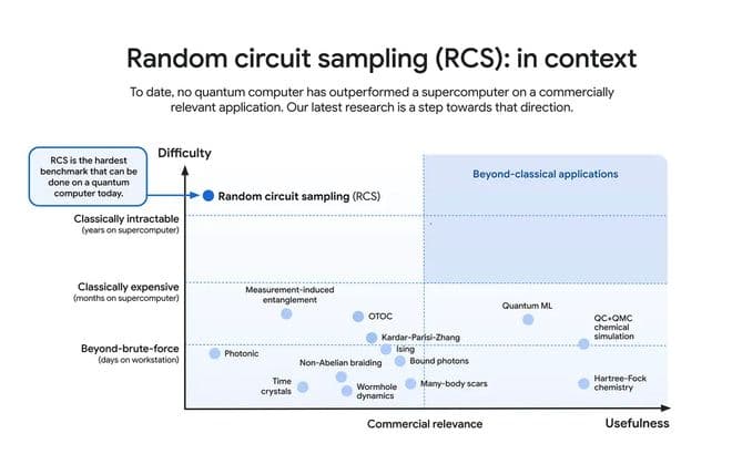 除了量子纠错性能外,Willow 处理器在随机线路采样(RCS)基准测试上也取得了惊人成果。它在不到 5 分钟内完成了一项运算,这项运算即使在当今最快的超级计算机 Frontier 上运行也需要 10 亿亿亿年(10²⁵年)。