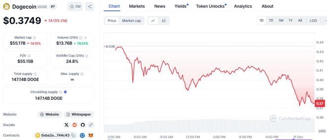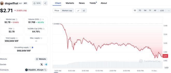 同时,Meme币盘中跌幅扩大,CoinMarketCap数据显示,市值在全球加密货币中排名第七位的狗狗币(DOGE)最近24小时跌超14%,市值排在第51位的dogwifhat(WIF)日内跌超20%。