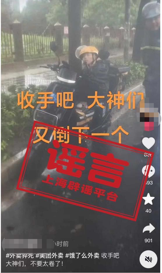 比如,在“跑外卖三单白干,雨中大哭”“女骑手深夜送餐,车辆被盗,崩溃大哭”等情节,带有明显的戏剧性,故意夸张乃至恶化骑手的工作环境。还有上海辟谣平台澄清的“上海台风天有外卖小哥当街猝死”,也是看图说话,为了博眼球而胡编乱造。这些视频看起来是同情外卖员,其实是消费外卖员,目的是迎合部分观看者对骑手群体的偏见,并放大外界对他们的刻板印象。