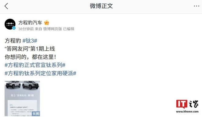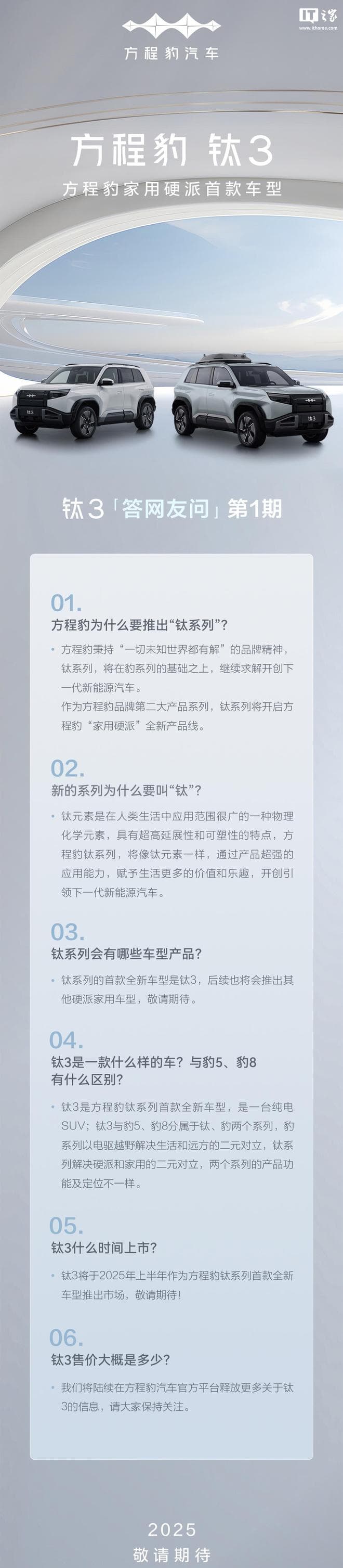 IT之家 12 月 11 日消息,比亚迪方程豹官方今日发布“答网友问”第 1 期,就新系列首款汽车“钛 3”相关问题作出解答。