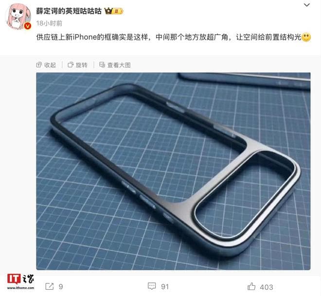 IT之家 12 月 13 日消息,消息源“薛定谔的英短咕咕咕”在微博发布一张号称是“供应链上新iPhone的框”照片,并称该机“中间那个地方放超广角,让空间给前置结构光”。