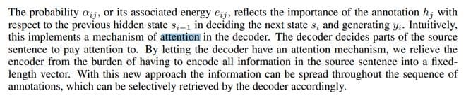 某一天,Dzmitry受到了英语翻译练习中的启发,人类在翻译时,目光会在源序列和目标序列之间来回移动,将软搜索表示为softmax,然后对BiRNN状态进行加权平均,就能让Decorder RNN学会在源序列中搜索放置光标的位置。