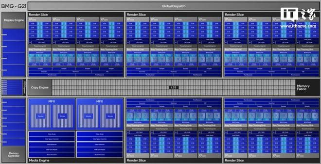 如上图所示,整个 BMG-G21 封装芯片中,Xe 2 的渲染切片有 5 组,每组 Xe 渲染切片中都包含 4 个 Xe 核心和 4 个光追单元和 4 个采样器,也就是 20 个 Xe 核心和 20 个光追单元。每个 Xe 核心内包含 8 个 512 位的 Vector Engine(矢量引擎)与 8 个 2048 位的 Engine(XMX 引擎),256KB 的 L1 缓存,对 L1 缓存命中率提升作用巨大。与锐炫 A 系列显卡相比,每个 Xe 核心的性能提高了 70%,每瓦性能提高 50%。