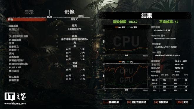 在 2K + 最高画质 + 超高光追阴影下,游戏平均帧数为 67 帧,1% Low 帧为 38 帧;在 2K + 最高画质 + 超高光追阴影 + XeSS 性能下,游戏平均帧数为 115 帧,1% Low 帧为 60 帧。