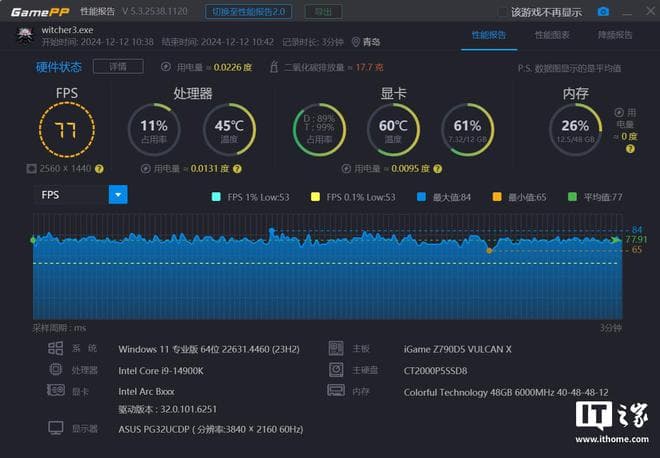 在 2K + 光线追踪画质下,游戏的平均帧数只有 45 帧,1% Low 帧为 37 帧;在 2K + 光线追踪画质 + XeSS 性能下,游戏的平均帧数涨到 77 帧,1% Low 帧为 53 帧;