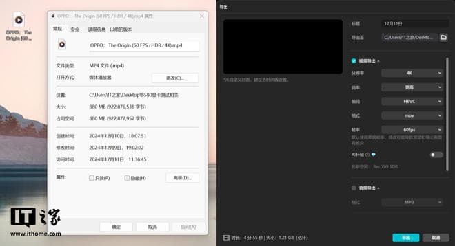 而在视频导出速度上,我们将一段时长 4 分 55 秒的 4K / 60FPS / HDR 视频导入剪映专业版中进行导出,导出时改为 HEVC 编码格式和 mov 文件格式。最终导出时间仅花费了 1 分 20 秒完成,导出视频的体积大小为 1.2GB 左右,效率同样出色。