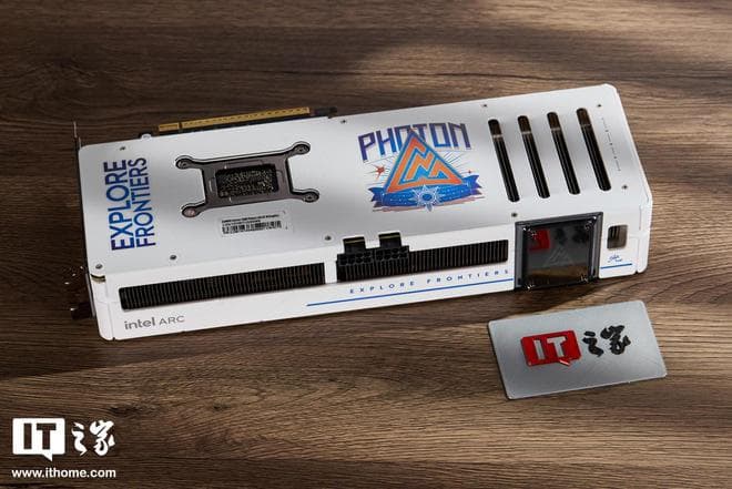 翻到显卡背面又会发现,大面积复古涂鸦风的英文标识和 Photon 图案,与背板上的其它开孔整齐地依次排开,彰显出强烈的复古未来主义风格,视觉元素多而不乱,很适合装在机箱里展示。