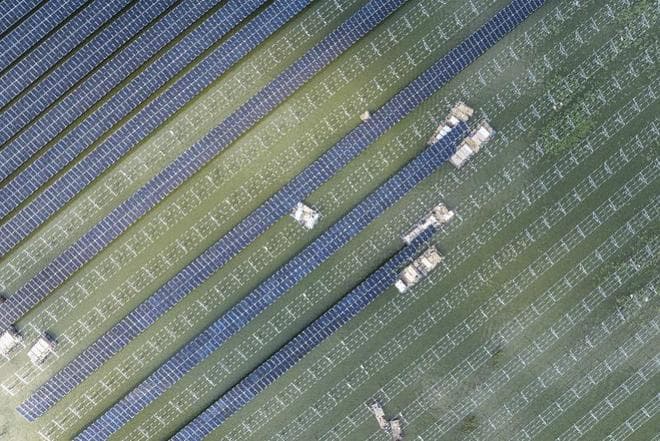 在浙江省余姚市滨海现代农业产业园,施工人员建设渔光互补光伏电站(无人机照片)。近年来,浙江余姚市着力构建以清洁能源为主的绿色电网工程,有序推进光伏发电站建设,将光伏产业与养殖业相结合,实现水上发电、水下养殖协同增效,让当地更多乡村和企业实现能源转型、绿色发展,助力当地乡村振兴。 新华社发