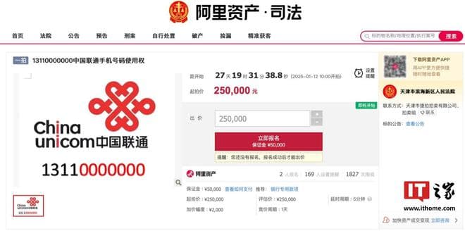 IT之家 12 月 15 日消息,据阿里资产拍卖平台,现有一个 131 开头、尾号为 0000000 的手机靓号上架拍卖,将于1月12日 10 点开拍,起拍价 25 万元,已有人报名参与竞拍。