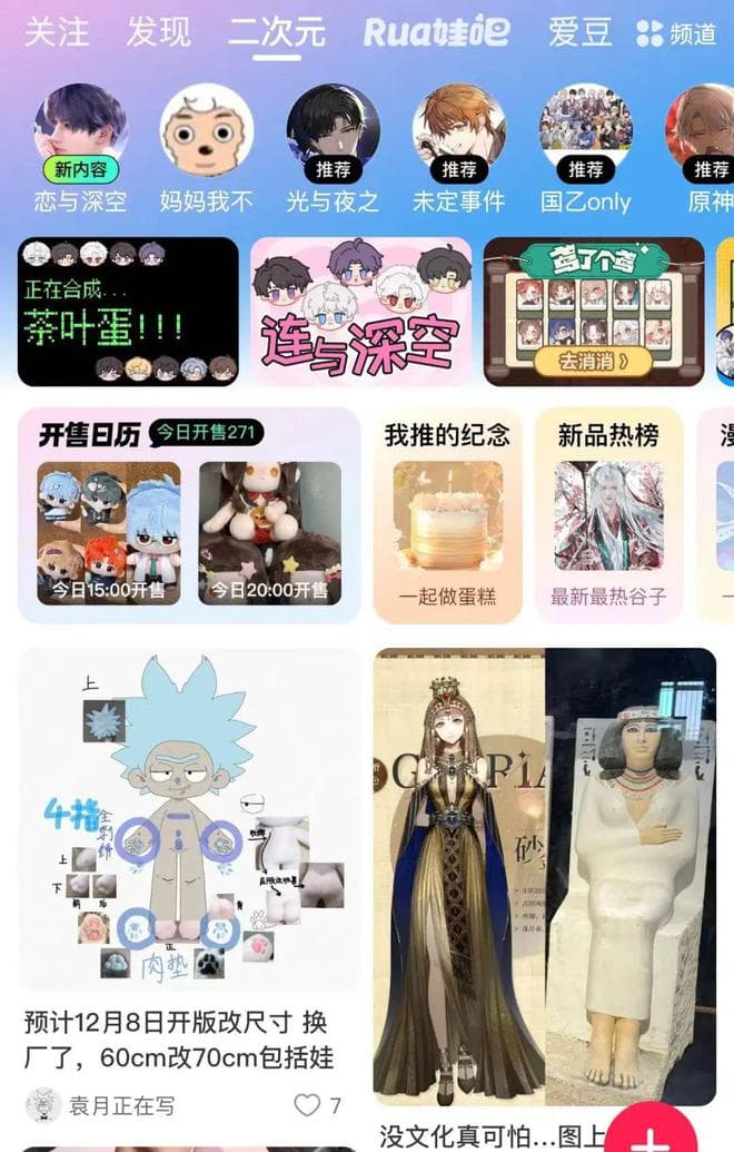 目前在小红书,"棉花娃娃"的相关笔记数量已达 300 万左右,"吧唧"更是达 700万+。借用小红书算法的精准推送,用户可以通过相关 IP 的二创找到交易对象。