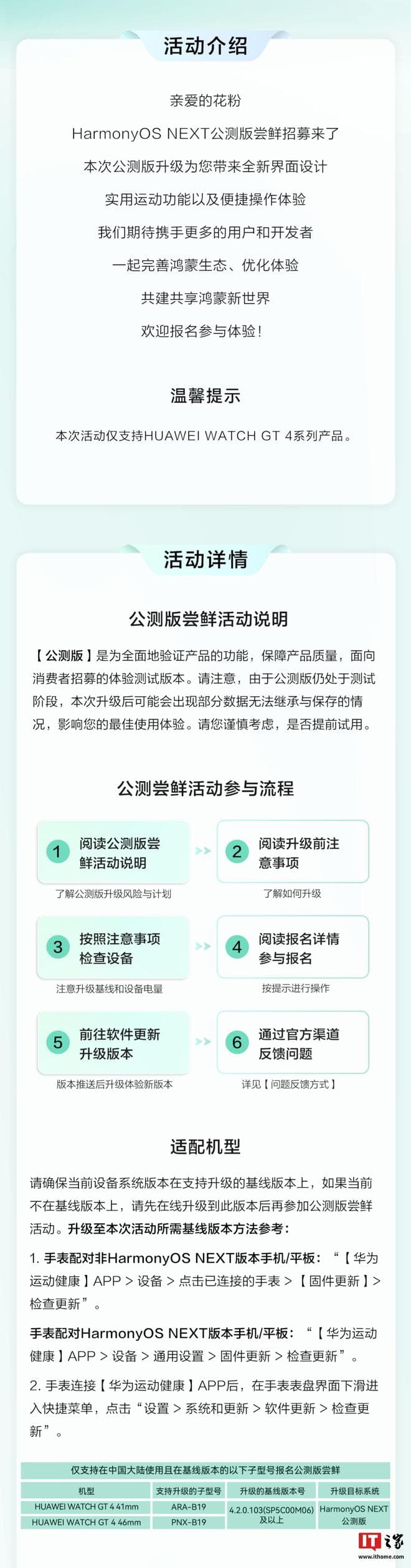 IT之家 12 月 16 日消息,华为 WATCH GT 4 系列手表今日开启纯血鸿蒙 HarmonyOS NEXT 公测版招募。