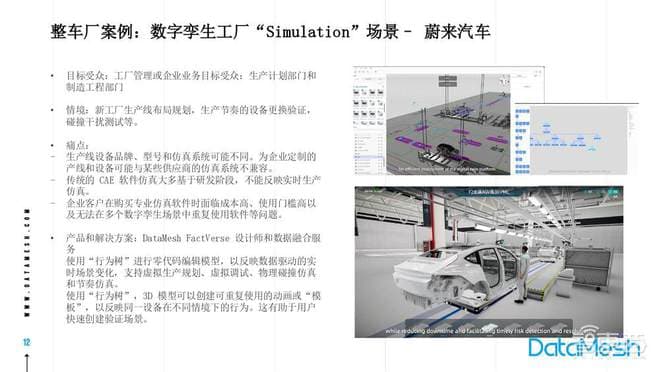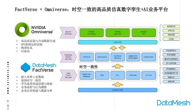 范寒露还提到,未来 FactVerse 将深度整合 NVIDIA Omniverse™ 平台高品质渲染与合成数据生成、物理仿真以及 AI 驱动等核心能力,为企业提供构建高品质的数字孪生+AI业务平台,并通过视频展示了在蔚来汽车数字孪生工厂的实际渲染效果。