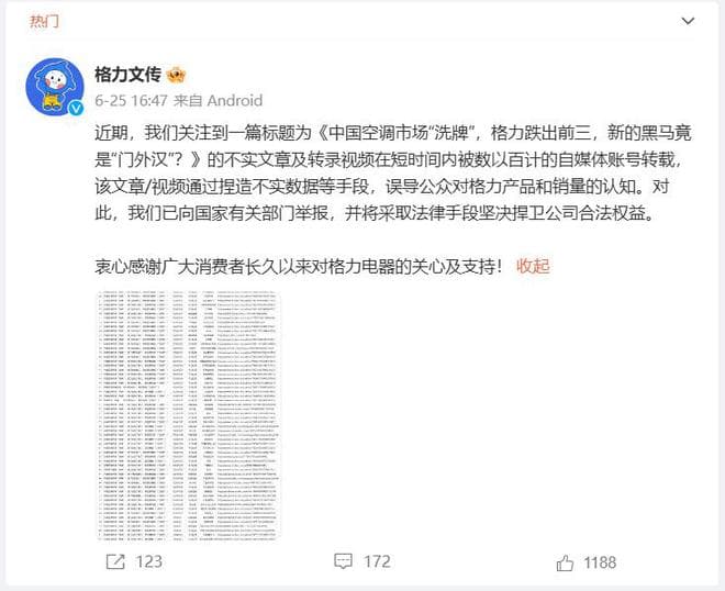 今年6月,格力文传发信息称,“近期,我们关注到一篇标题为《中国空调市场“洗牌”,格力跌出前三,新的黑马竟是“门外汉”?》的不实文章及转录视频在短时间内被数以百计的自媒体账号转载,该文章/视频通过捏造不实数据等手段,误导公众对格力产品和销量的认知。对此,我们已向国家有关部门举报,并将采取法律手段坚决捍卫公司合法权益。 ”