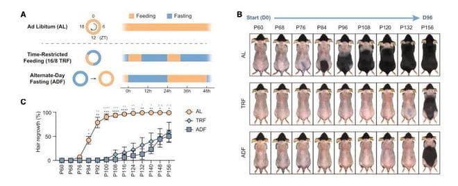 研究团队为小鼠设计了三种进食方案:正常饮食组、16/8限时进食组、隔日禁食组。实验前所有小鼠被剃掉毛发,96天后,正常进食组的小鼠毛发恢复如初,16/8限时进食组、隔日禁食组只恢复部分区域的毛发,稀稀拉拉。