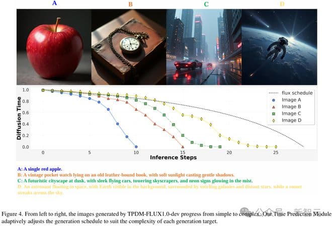 通过强化微调训练,模型能根据输入图像自适应地调节扩散时间的衰减速度,在面对不同的生成任务时推理不同数量的去噪步数。对于简单的生成任务(较短的文本提词、生成图像物体少),推理过程能够很快生成高质量的图像,噪声强度衰减较快,模型只需要思考较少的额外步数,就能得到满意的结果;对于复杂的生成任务(长文本提词,图像结构复杂)则需要在扩散时间上密集地进行多步思考,用一个较长的图像链COT来生成符合用户要求的图片。
