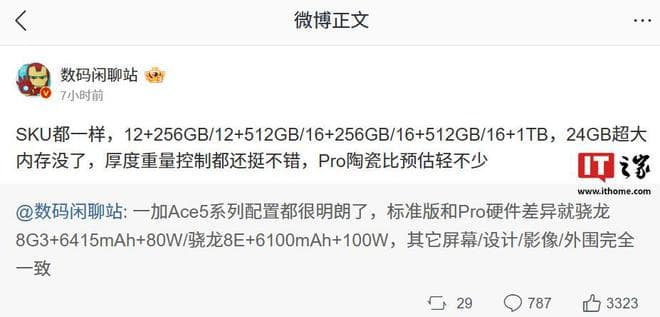 消息称一加 Ace 5 系列手机没有 24GB 内存版本