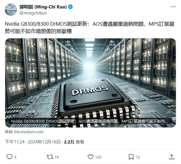 IT之家 12 月 17 日消息,天风证券分析师郭明錤今天(12 月 17 日)发布投资研究报告,表示英伟达正为 GB300 和 B300 开发测试 DrMOS 技术,发现 AOS 的 5x5 DrMOS 芯片存在严重过热问题。这一问题可能影响系统量产进度,并改变市场对 AOS 订单的预期。