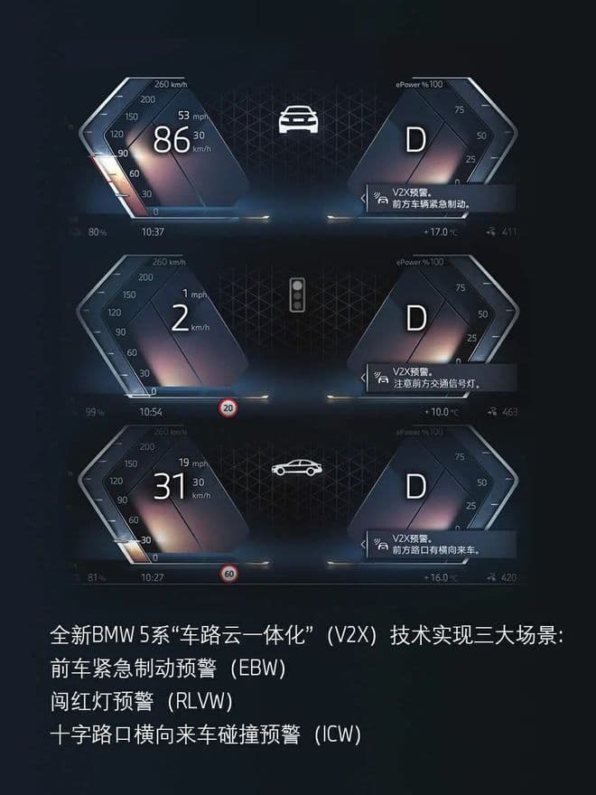 目前宝马V2X技术可以实现前车紧急制动预警(EBW)、闯红灯预警(RLVW)以及十字路口横向来车碰撞预警(ICW)3个场景功能。
