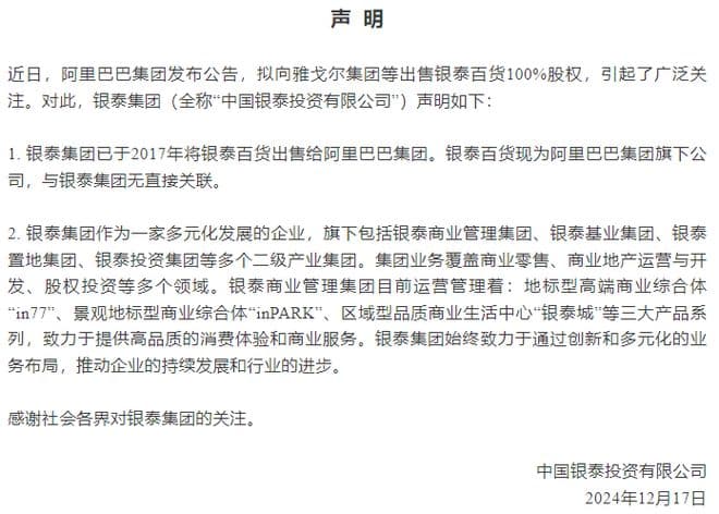 对此,中国银泰投资有限公司(简称“银泰集团”)发布声明称,银泰集团已于2017年将银泰百货出售给阿里巴巴集团。银泰百货现为阿里巴巴集团旗下公司,与银泰集团无直接关联。