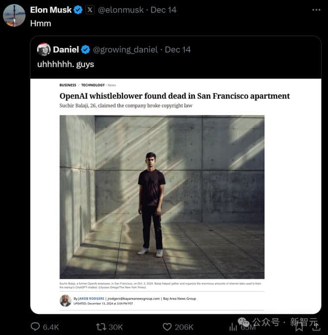 几天前,消息曝出,曾在OpenAI工作四年,指控公司侵犯版权的Suchir Balaji,上月底在旧金山公寓中被发现死亡,年仅26岁。