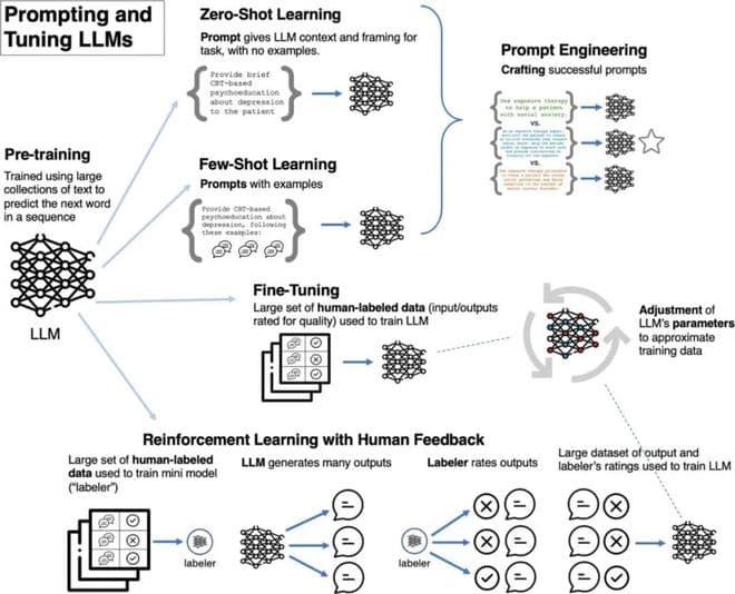 大语言模型的兴起,得益于Transformer深度学习技术[25]和计算能力的提升[26]。这些模型首先使用“无监督”学习在大量数据上进行训练,其中模型的任务是预测单词序列中的给定单词[27,28]。然后可以通过包括使用示例提示或微调等方法,对模型进行特定任务的定制,其中一些方法不需要或只需要少量特定任务的数据(见图1)[28,29]。LLM在临床应用方面具有潜力,它们可以解析人类语言并生成类似人类的回复,对文本进行分类/评分(即标注),并灵活采用代表不同认知理论对应的对话风格。