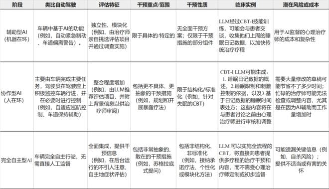 将LLM整合到心理治疗中,可表述为从辅助型AI(assistive AI)连续衍变(continuum)为完全自主型AI(fully autonomous AI),类比其他领域的AI整合模式,如自动驾驶汽车行业(见图3和表1)。