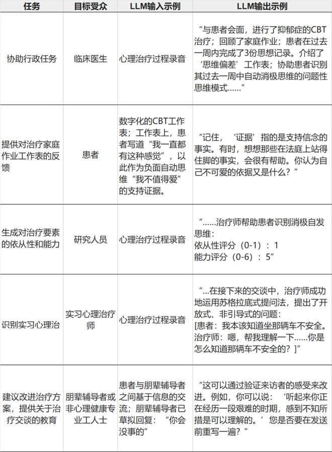 需要注意的是,以下列出的许多潜在的应用都是理论上的,尚未得到开发,更不用说彻底评估。此外,我们使用“临床LLM”这一术语,前提是承认一个事实,LLM的工作在何时、何种情况下才可称为“心理治疗”,这取决于对心理治疗的定义,下定论还为时尚早。