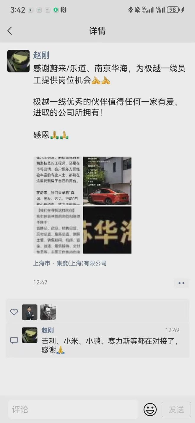 【极越产品线负责人:感谢蔚来、华海等车企为极越一线员工提供岗位】12月17日,极越汽车CEO业务顾问兼产品线负责人赵刚在其微信朋友圈发文表示,感谢蔚来/乐道、南京华海,为极越一线员工提供岗位机会。此外,赵刚还透露,吉利、小米、小鹏、赛力斯等车企都在对接中。(每日经济新闻)