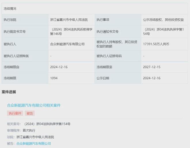 【哪吒汽车所持1.7亿股权被冻结】天眼查法律诉讼信息显示,12月16日,哪吒汽车关联公司合众新能源汽车股份有限公司新增一则股权冻结信息,股权被执行的企业为众联天下汽车销售服务有限公司,冻结股权数额约1.7亿人民币,冻结期限自2024年12月16日至2027年12月15日,执行法院为浙江省嘉兴市中级人民法院。合众新能源汽车股份有限公司成立于2014年10月,法定代表人为方运舟,注册资本约28.4亿人民币,由南宁民生新能源产业投资合伙企业(有限合伙)、宜春市金合股权投资有限公司、桐乡众合新能源汽车产业投资合伙企业(有限合伙)等共同持股。风险信息显示,该公司现存多条股权冻结信息。(金融界)