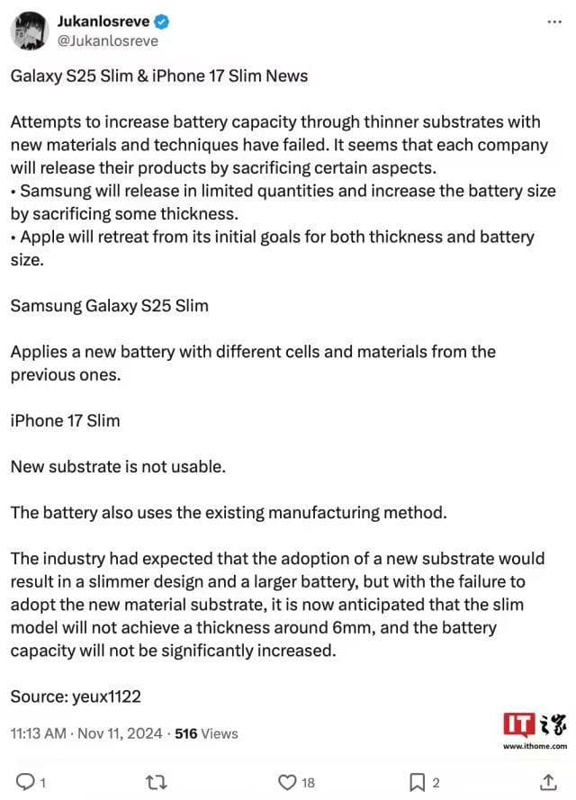 需要注意的是,消息源 Jukanlosreve 曾在 11 月透露,苹果的超薄高密度电池项目开发失败,iPhone 17 Air 面临“变厚”局面。