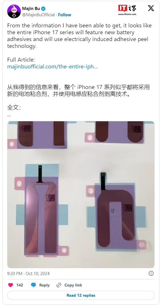 最后是电池。据@Majin Bu 透露,iPhone 17 全系会采用新的电池粘合剂。