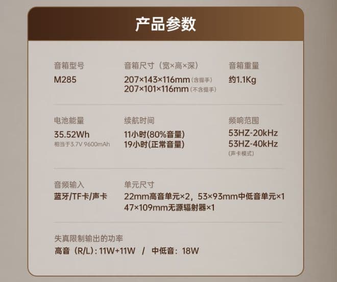 IT之家附漫步者 M285 便携音箱产品尺寸、产品参数如下: