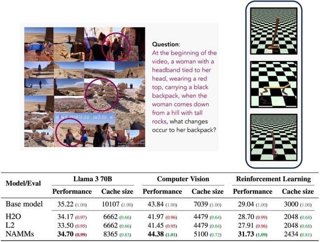 研究表明,他们的约束(conditioning)方法具有通用性,可以实现对全新基础模型的零样本迁移。特别是,他们在大型 Llama 70B LM 以及针对不同模式设计的 Transformer (如 Llava Next Video 和 Decision Transformer)上评估了 NAMM,以解决计算机视觉和强化学习任务。即使在这些非分布式环境中,NAMM 也能通过丢弃多余视频帧和次优动作等 token 保持其优势,从而使其新的基础模型能够专注于最相关的信息,从而提高性能。