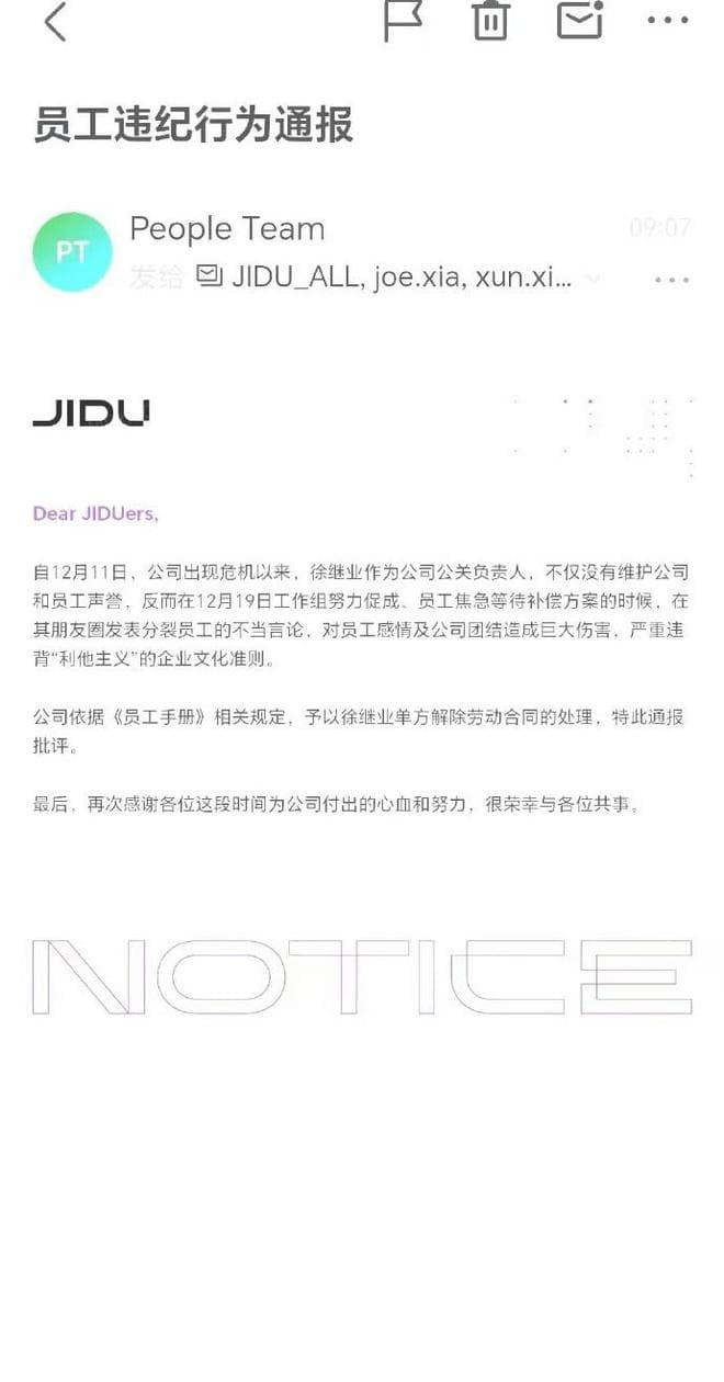 12月20日消息,今天上午,极越公司发布内部邮件,宣布因“在其朋友圈发表分裂员工的不当言论”,解除公关负责人徐继业的劳动合同,并通报批评。