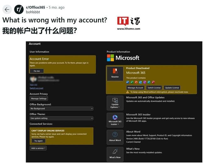 根据 Reddit 社区和微软论坛上用户反馈,受影响的用户在 Office 应用程序中随机收到这些“产品已停用”错误,导致混乱和中断。