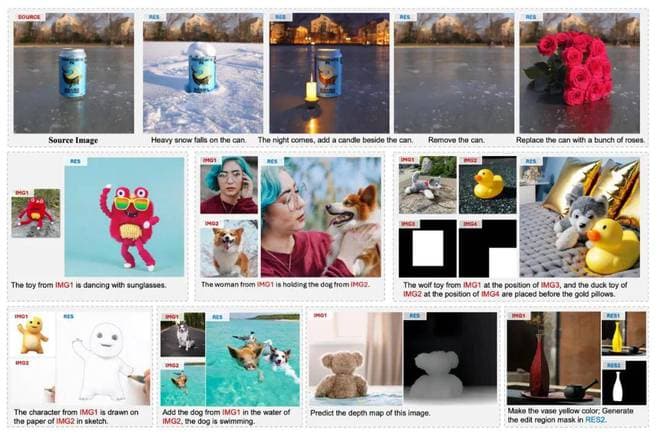 我们重点展示了图像生成与编辑中最具挑战性的三个任务的效果:图像定制化生成、指令编辑和物体插入。