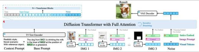 模型结构:我们借鉴了与Sora类似的视频生成架构,将不同的输入输出图像统一视作视频帧处理。具体来说,图像通过 VAE 编码后被转换为视觉 token,接着输入 Transformer 进行处理。与此同时,我们引入了T5 text encoder对输入指令进行编码,将生成的文本 token 与视觉 token 一同输入 Transformer。通过使用full attention机制,模型能够充分建模视觉和文本之间的关系,实现跨模态信息的高效融合和综合理解。这种设计确保了模型在处理多样化任务时的灵活性和生成效果的一致性。