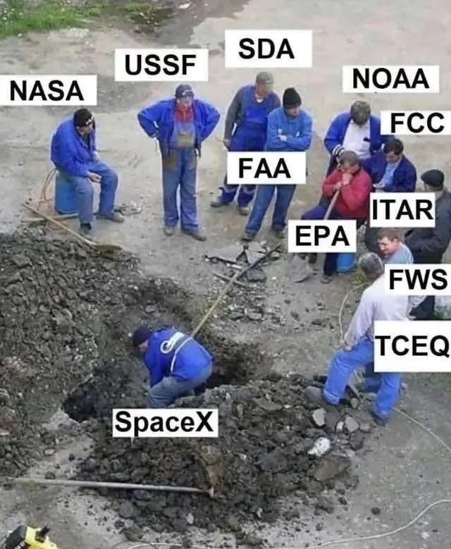 一直以来,美国航天项目的发射审批都很繁琐,需要报备的部门就不下 10 个,网上还有人专门做了整理(不想看的差友请直接看图):项目计划(卫星设计、轨道选择和任务目标,得符合 ITAR 、 TCEQ 有关贸易和相关消费服务的标准)—> 频率和轨道资源申请协调( FCC 以及国际电信联盟 ITU )—> 环境影响评估( EPA 、 FWS 、 NOAA )—> 涉及国家安全的需要通过安全审查( USSSF 、 SDA )—> 发射许可证申请( FAA 旗下的 AST )—> 与发射场运营商协调发射时间和场地 —> 发射前检查( FAA 、 USSSF 、 NOAA 、 EPA 、美国太空司令部、海岸警卫队等)—> 向美国海岸警卫队和其他相关机构发出发射通知 —> 获得所有必要许可、完成准备工作后,执行发射任务 —> 发射后按照监管要求确保轨道维护和空间碎片减缓措施( NOAA )—> 按国际惯例通报发射计划和执行结果( NASA )。