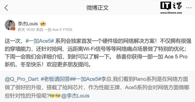 一加李杰:Ace 5 系列独家首发一个硬件级网络解决方案