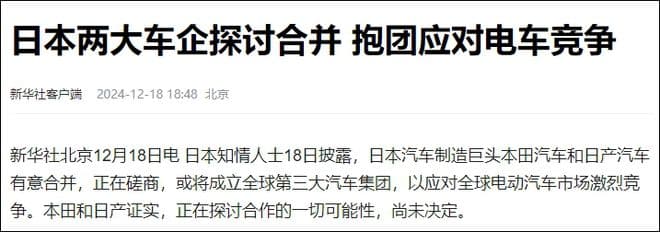 在日本,2024年12月17日,第二大车企本田和第三大车企日产则在考虑成立一家控股企业,将本田和日产的汽车业务置于其旗下——简而言之就是,本田和日产要一起合作造车了。