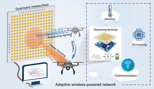 该成果首次构建了一种基于双频超表面的无线传能、感知定位和通信一体化系统,实现自适应的无线能量传输(Adaptive wireless power transmission,简称 AWPT)。