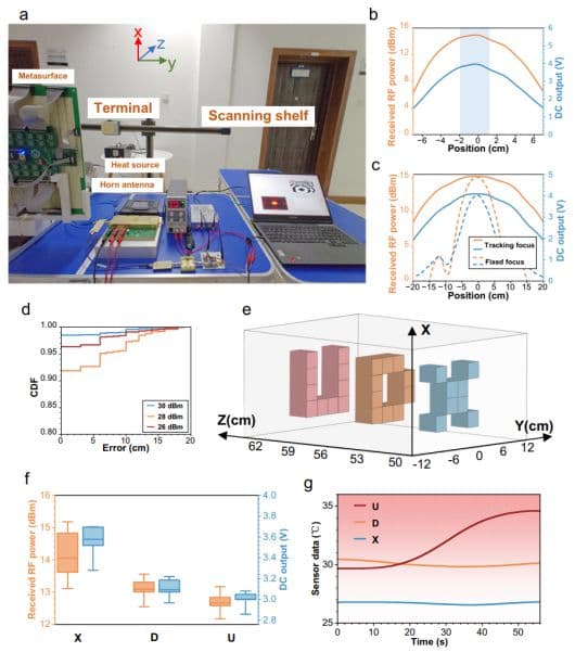 该研究还利用数字编码超表面对电磁波的灵活调控特性,将无线能量实时、高效地聚焦到动态的终端设备上,实现无电池供电的感知定位和通信一体化系统。