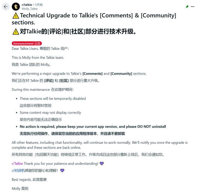 次日,Talkie在论坛内发布公告称:正在对Talkie部分功能进行重大升级。